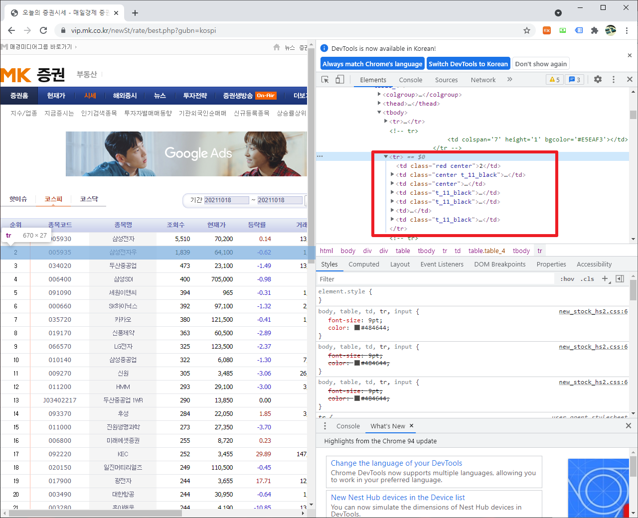 여기에서 개발자 도구를 통해서 출력하고자 하는 부분을 선택합니다. 그 부분을 선택하여 출력할 수 있도록 해보겠습니다.