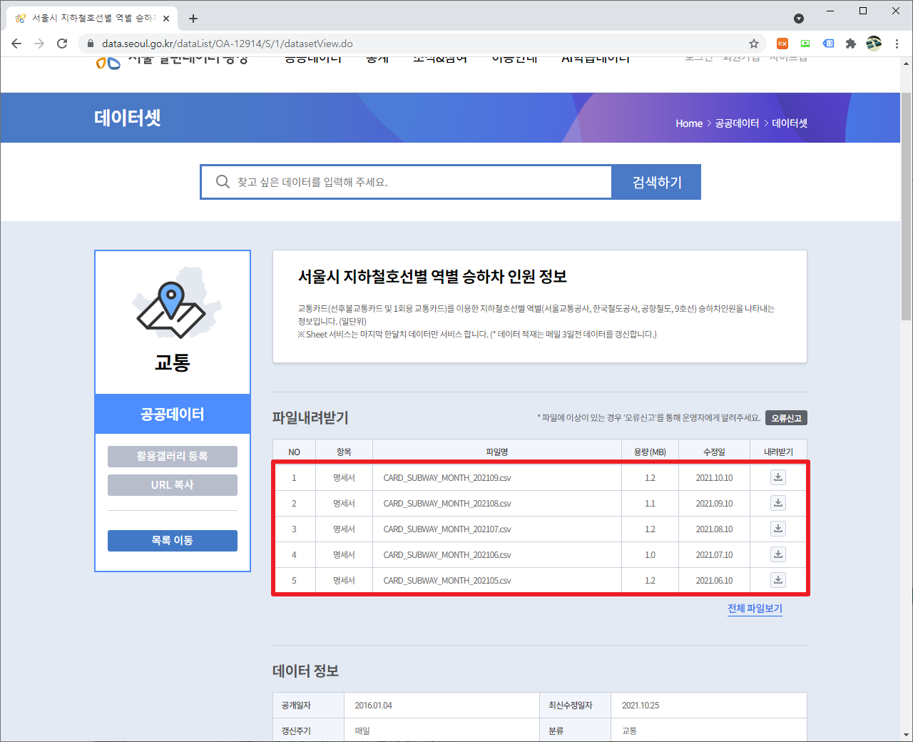 서울 지하철 승하차 통계 정보 다운로드 받기 본문