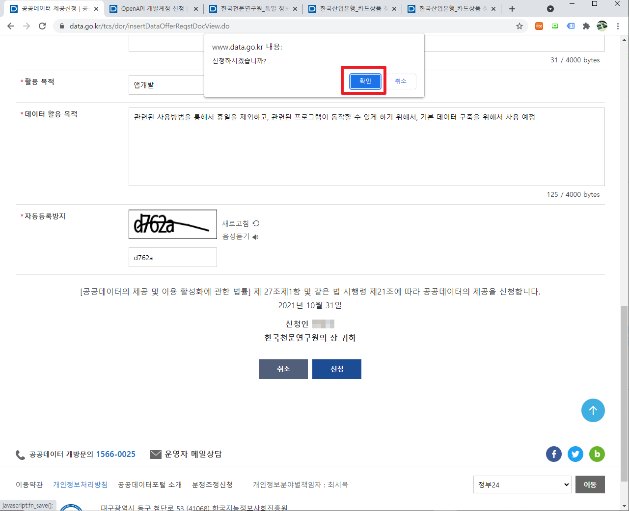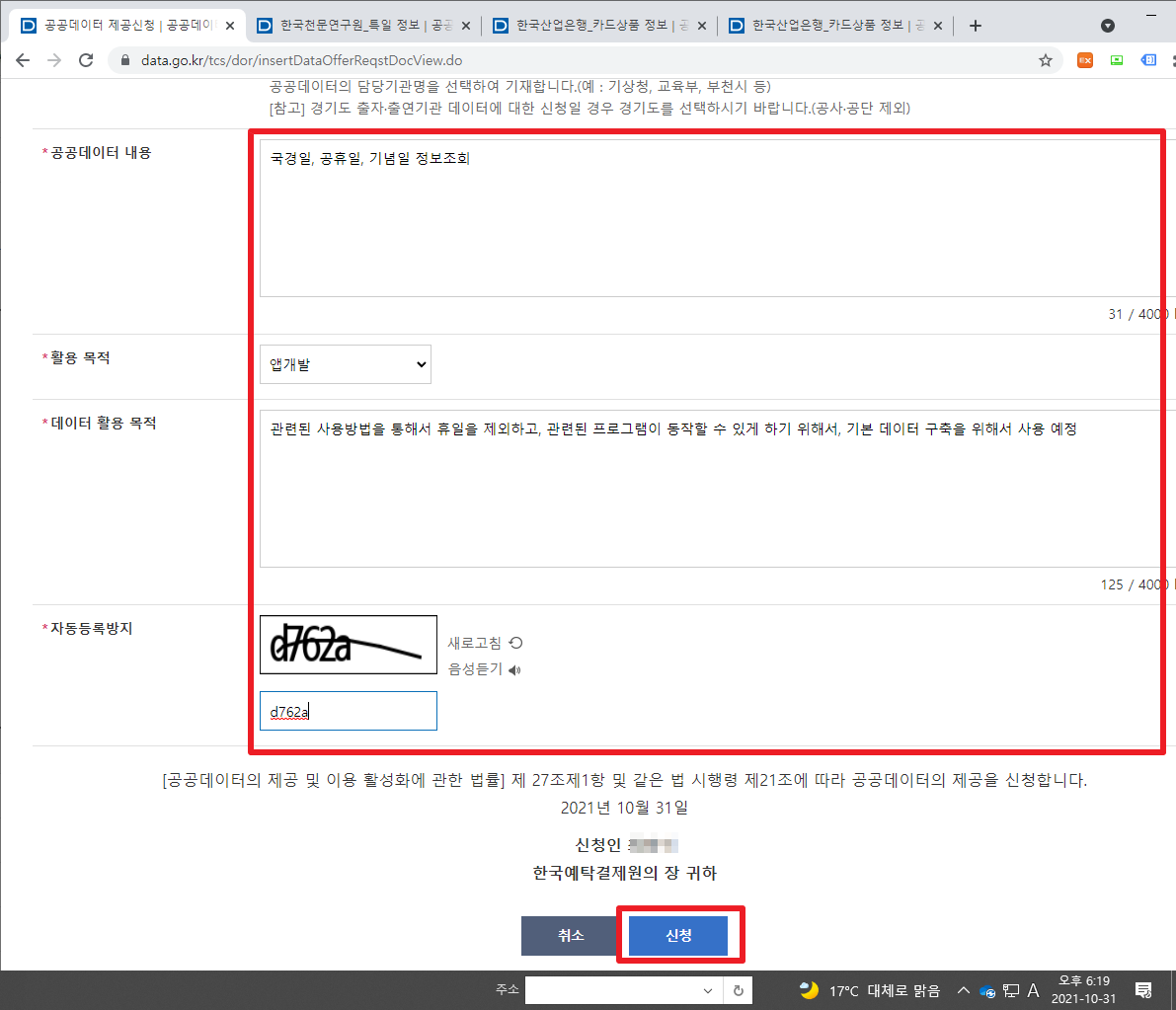 그런 후에 기본적인 신청인의 정보를 입력하시고나서, 공공 데이터명과 그에 따른 기관명을 입력해주셔야 합니다. 그리고 나서, 다음과 같이 보이는 요청하는 추가적인 정보들을 입력해주시길 바랍니다.