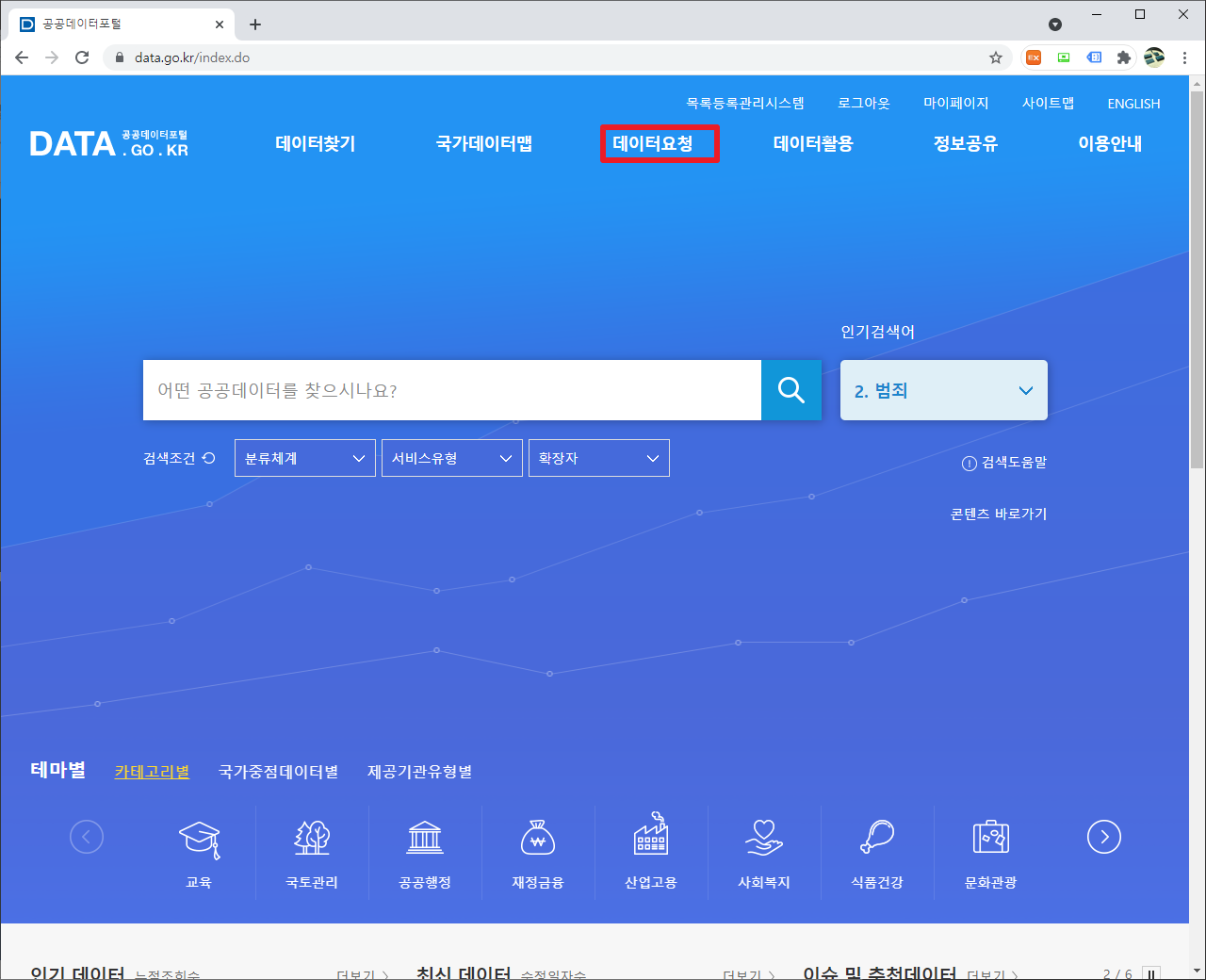 그럼 상단에 보이는 [데이터 요청] 부분을 클릭하여 주시길 바랍니다.