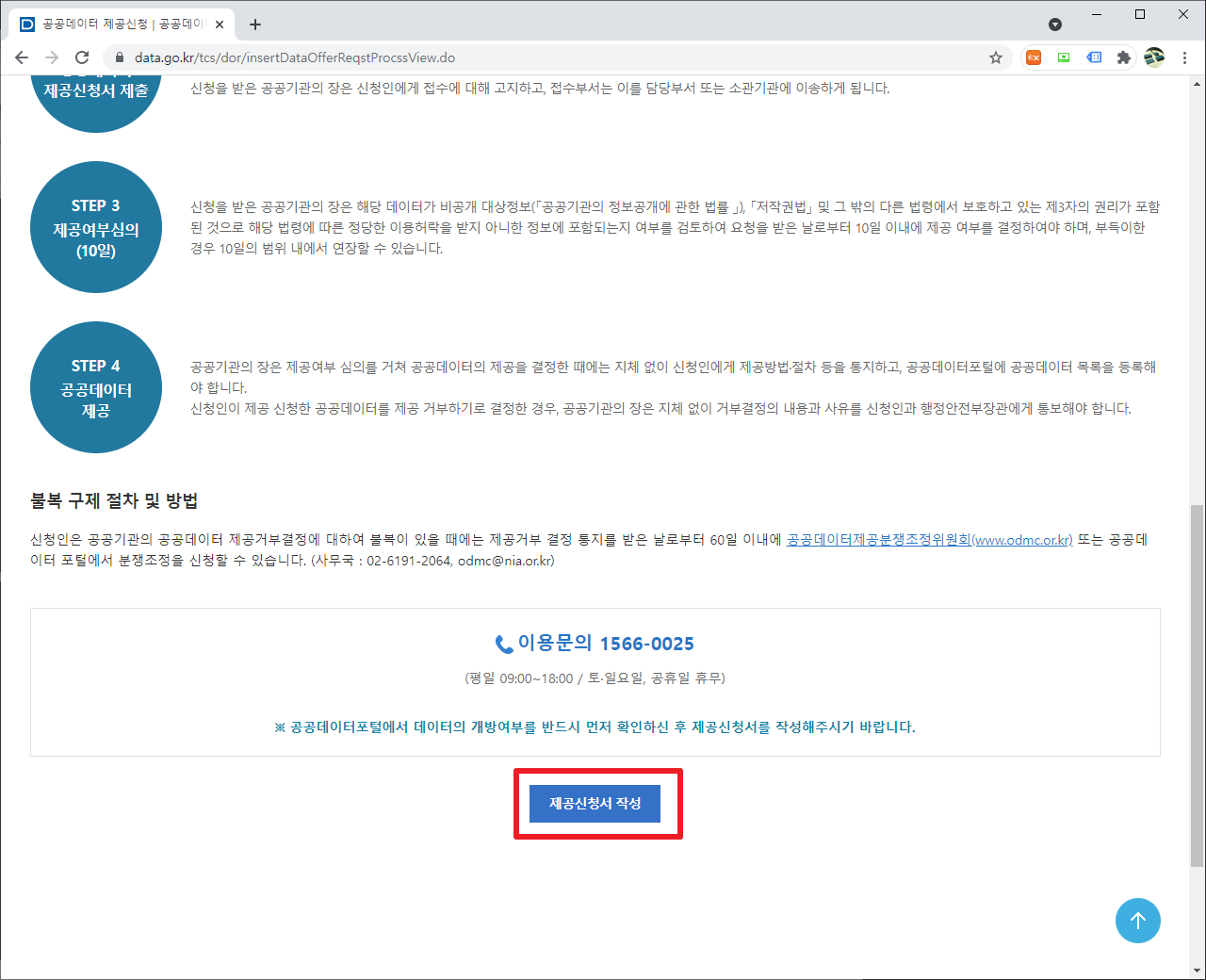 그럼 여기에서 신청하는 부분에 대해서 간단한 절차등에 대해서 설명이 나오는 페이지로 이동합니다. 여기에서 하단에 있는 [제공신청서 작성]부분을 클릭해주시면 됩니다.