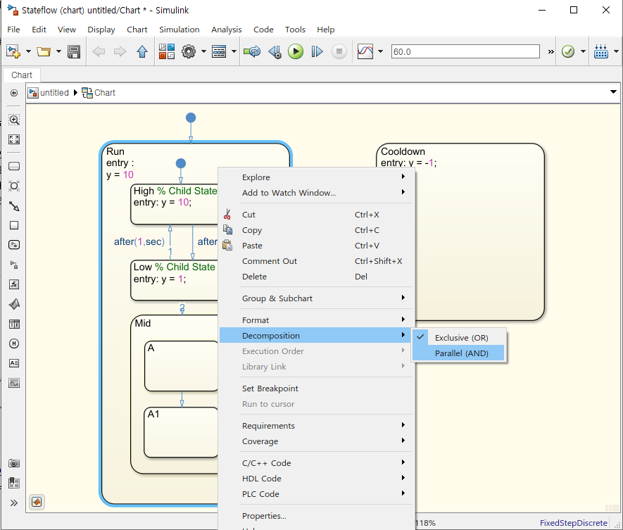 먼저 Parallel State Diagram를 만드고자 하는 Level에서 마우스 오른쪽 버튼을 누리소그 Decomposition으로 눌려주세요.