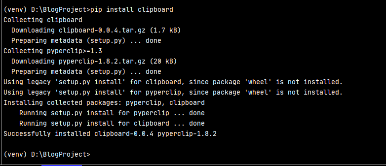 먼저, clipboard의 경우 기본 모듈이 아니기 때문에 별도 설치가 필요로 합니다. 그 경우 다음 명령어를 이용하여 설치 해주 셔야 합니다.
