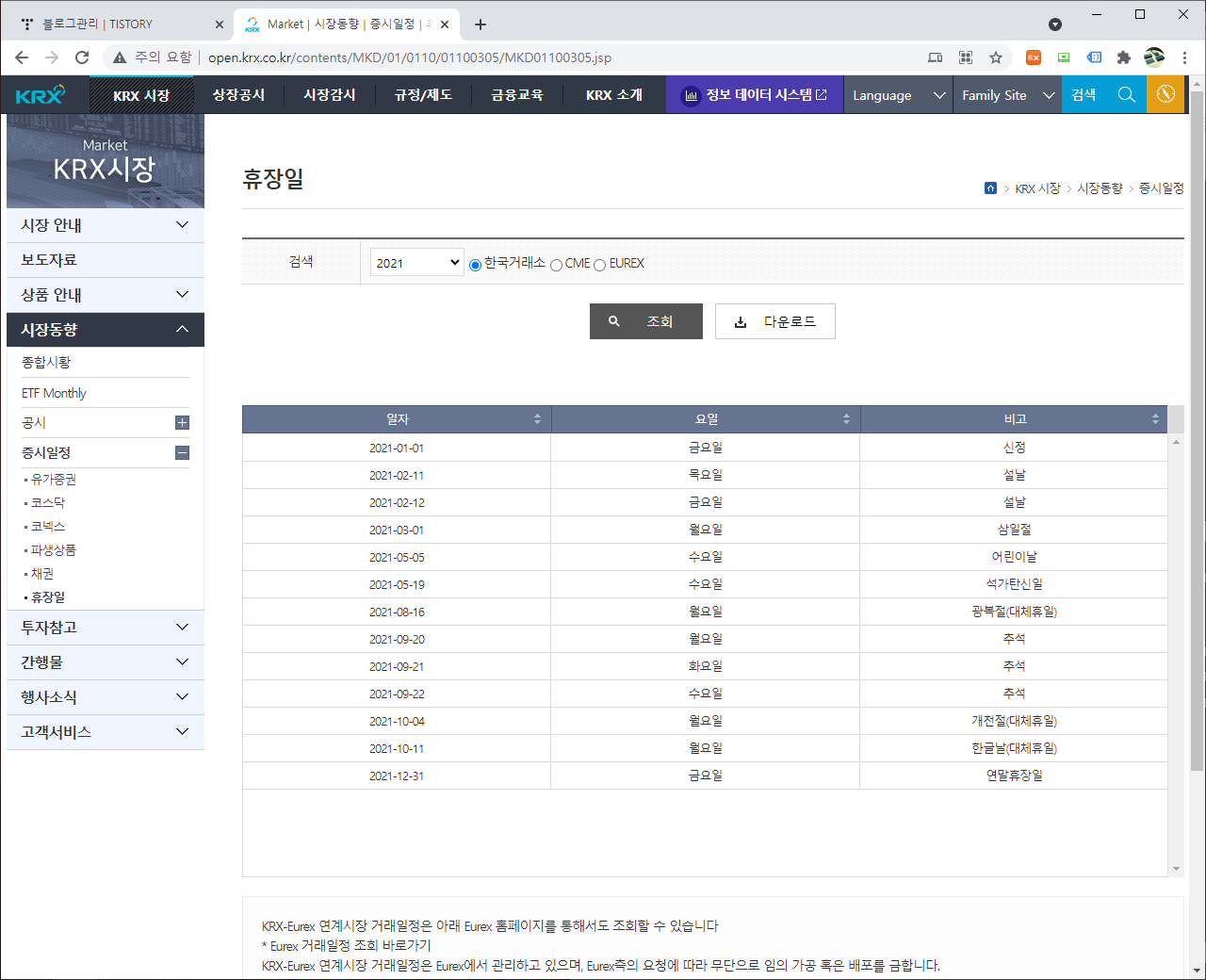 이번에는 주식 관련된 공부를 하면서, 휴장일에 대해서 사전에 확인할 수 있다면 얼마나 좋을까라는 생각을 해봤습니다. 그래서 관련된 정보를 찾다보니, 생각보다 많았습니다. 저 또한 관련된 포스팅을 제 블로그에 포스팅을 한적이 있습니다.