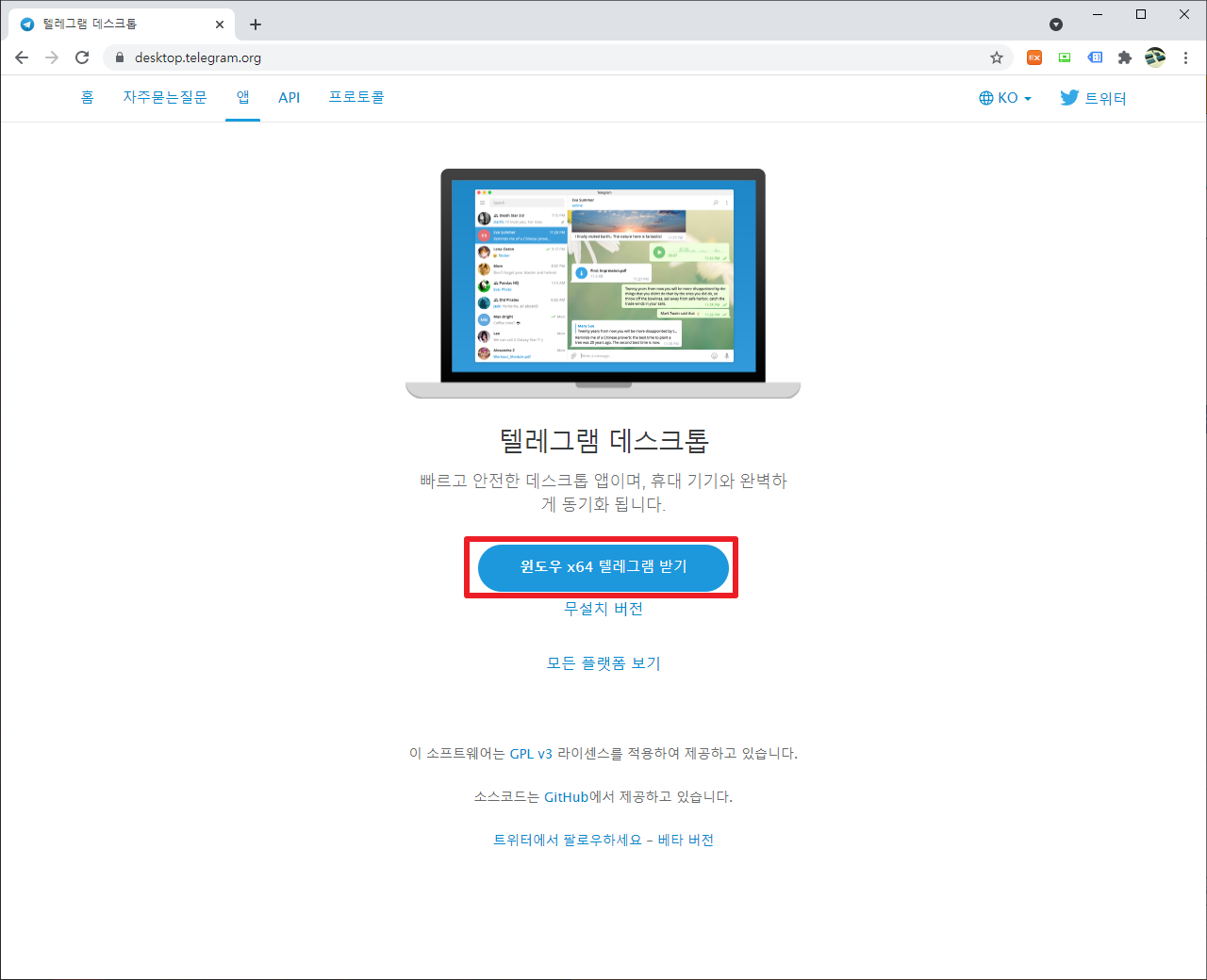 위의 링크를 클릭하시면 다음과 같은 화면이 나타날 것입니다. 여기에서 다음보이는 부분과 같이 [윈도우 x64텔레그램 받기]부분을 클릭하여 주시길 바랍니다.