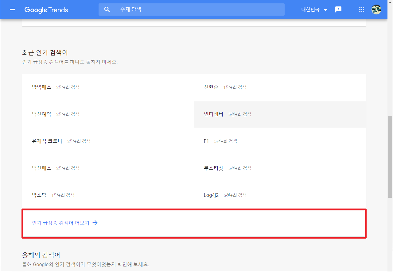 그럼 다음과 같은 화면이 나타날 것입니다. 여기에서 "최근 인기 검색어"부분의 하단 부분에 있는 [인기 급상승 검색어 더보기]부분을 클릭하여 주시길 바랍니다.