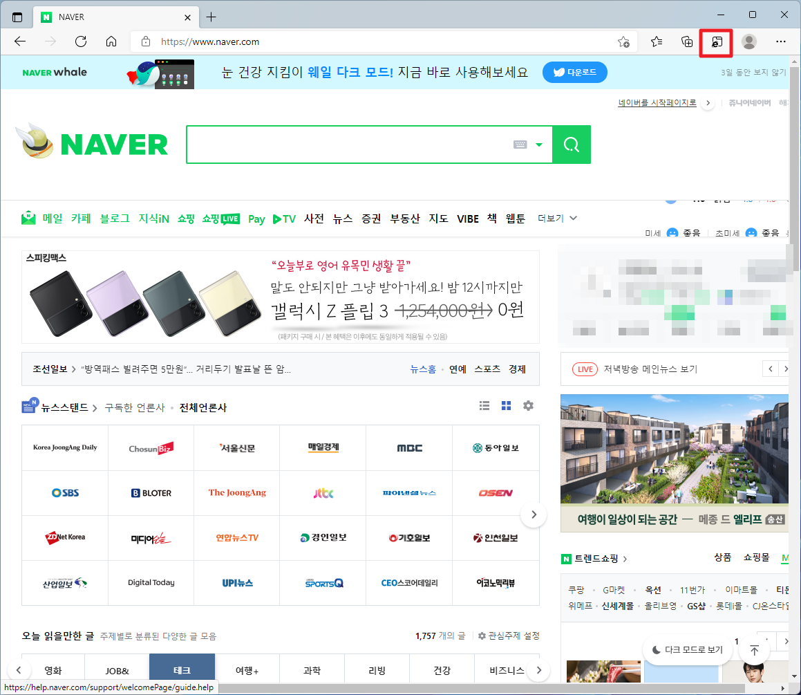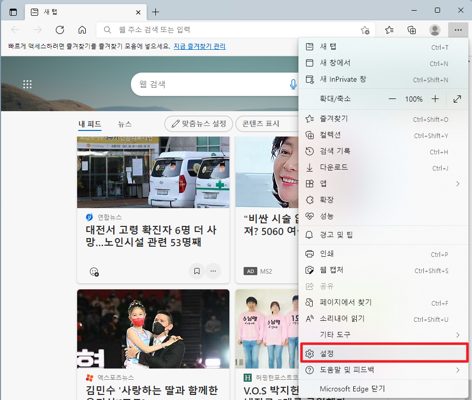 먼저, 윈도우11에 기본제공되는 엣지 브라우저를 실행하여 주시길 바랍니다. 그리고 나서 다음과 같이 화면 우측 상단에 있는 더보기 표시(점점점)부분을 클릭하여 주시길 바랍니다.