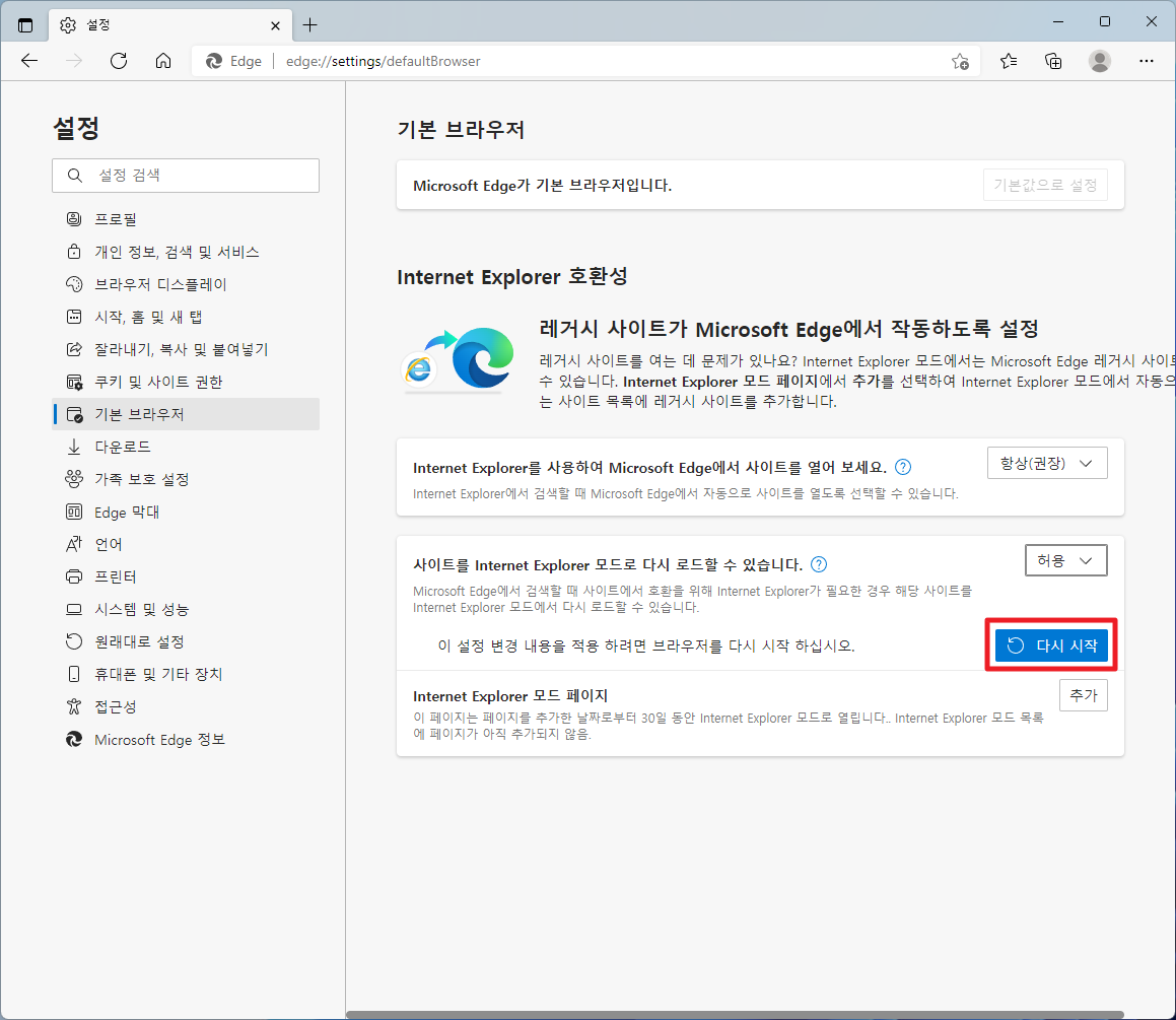 그럼 다음과 같이 기본 브라우저에 대한 메뉴들이 나타납니다. 여기에서 Internet Explorer 호환성의 하위메뉴로 "Internet Explorer를 사용하여 MIcrosoft Edge에서 사이트를 열어보세요" 및 "사이트를 Internet Explorer모드로 다시 로드할 수 있습니다"라는 부분이 나타날 것입니다. 다음과 같이 설정을 해줍니다.
