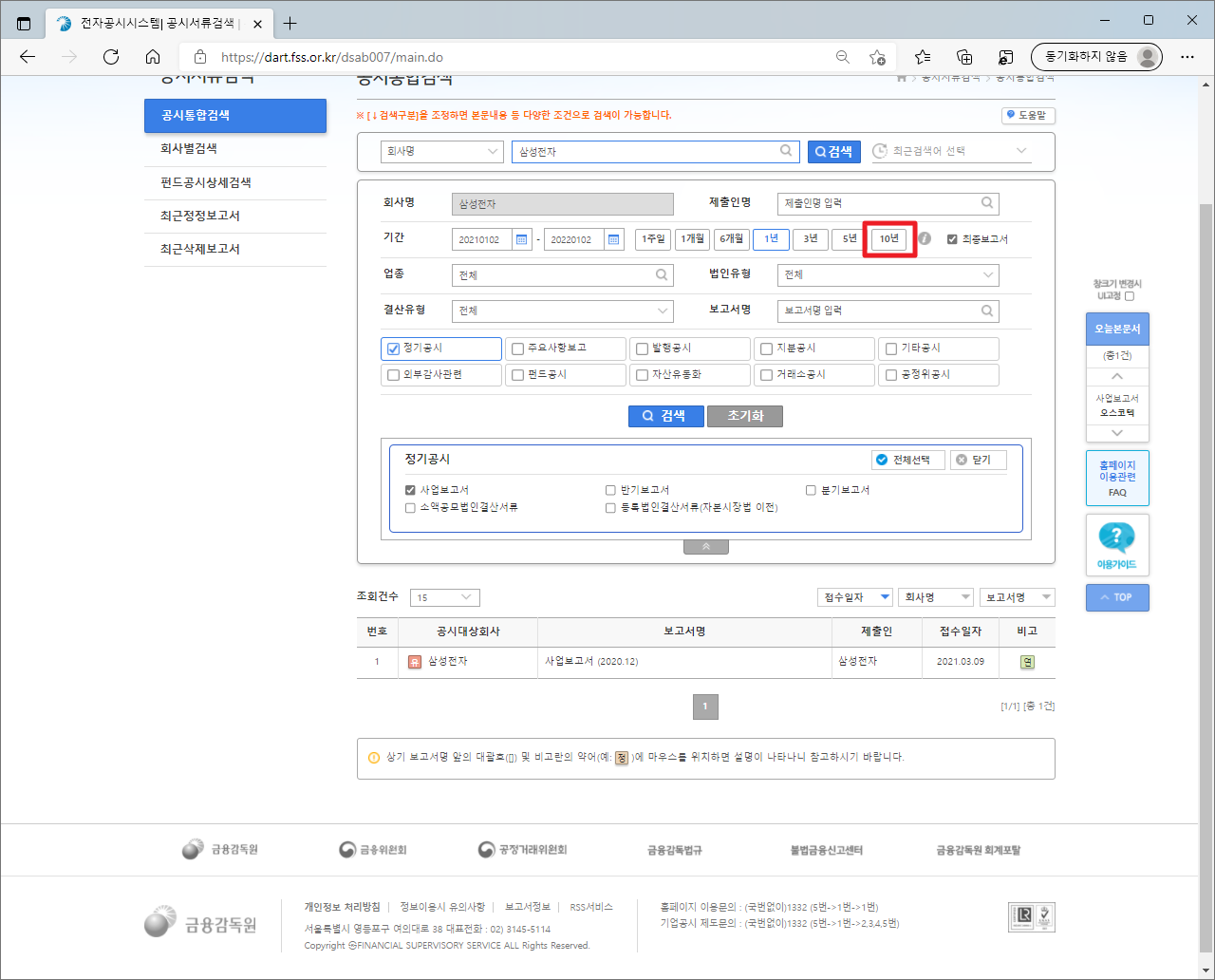 그럼 다음과 같이 사업 보고서가 나타난 것을 확인할 수 있습니다. 여기에서 과거 부분들까지 확인하고 싶으시면, 상단에 기간에 있는 부분에서 5년 또는 10년 부분을 선택하여 주시길 바랍니다.