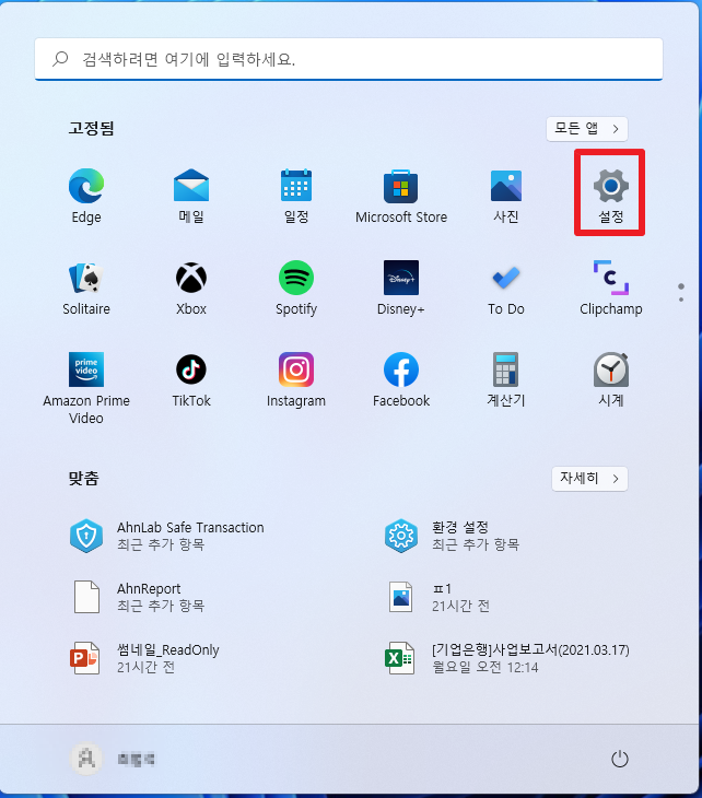 그래서 이번 포스팅에서는 그 중 하나인 마우스 커서를 변경하는 방법에 대해서 포스팅을 해보고자 합니다. 먼저, 윈도우 키를 이용하여 메뉴를 열어 줍니다. 그중에서 다음에서 보이는 바와 같이 [설정]부분을 클릭하여 주시길 바랍니다.