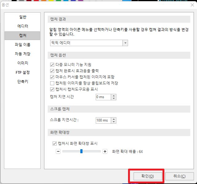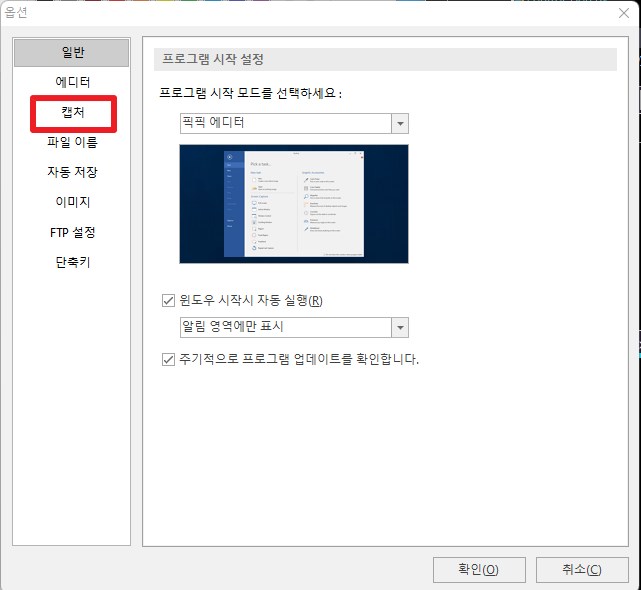 위에서 [옵션]부분을 클릭하셨다면, 다음과 같은 화면이 나타날 것입니다. 여기에서 [캡처]부분을 클릭하여 주시길 바랍니다.