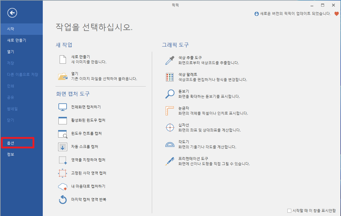 대부분은 다음과 같은 화면에서 시작될 것이라고 생각합니다. 여기에서 좌측에 보이는 [옵션]부분을 클릭하여 주시길 바랍니다.