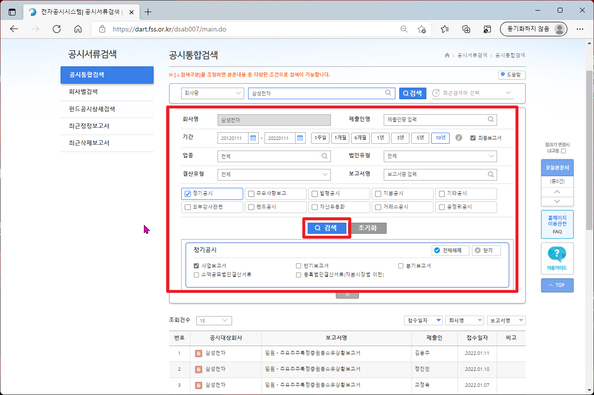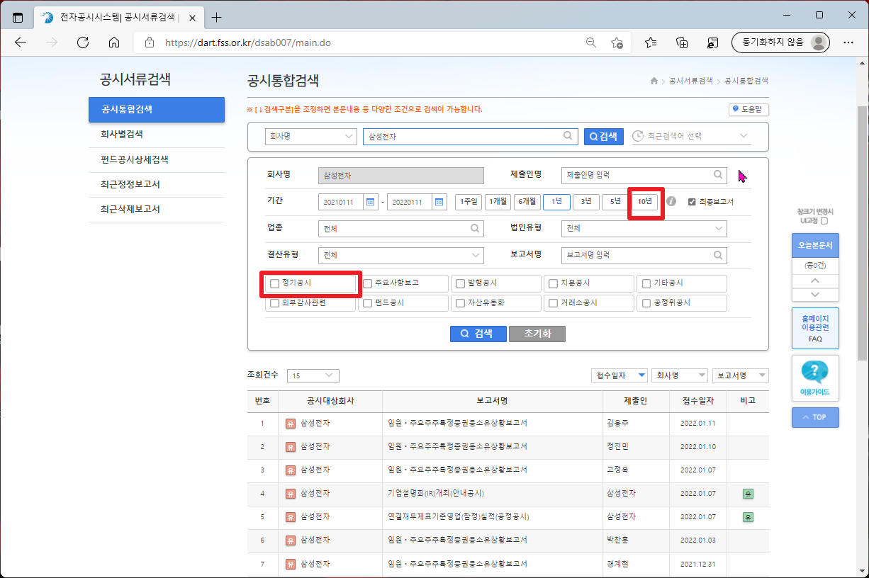 그리고 나서, 다음과 같이 기간에서 [10년] 부분을 선택하시고, [정기공시]을 클릭하여 주시길 바랍니다. 실제 정기 공시 부분에서는 체크 박스 말고, 글자 부분을 클릭하셔야지 하위 메뉴들이 나타납니다.