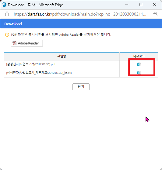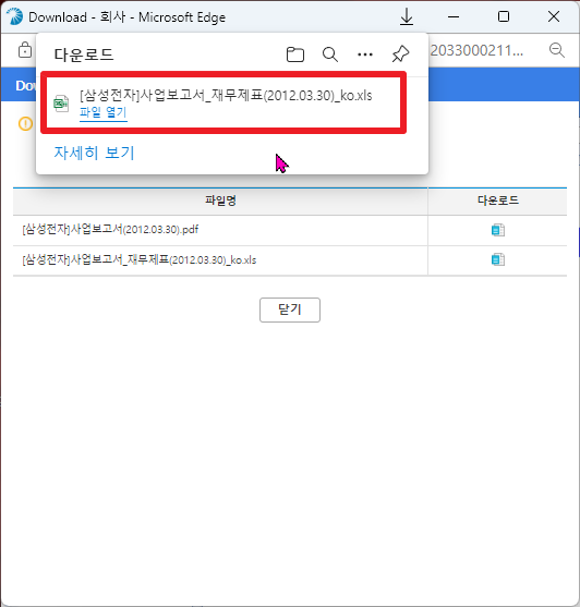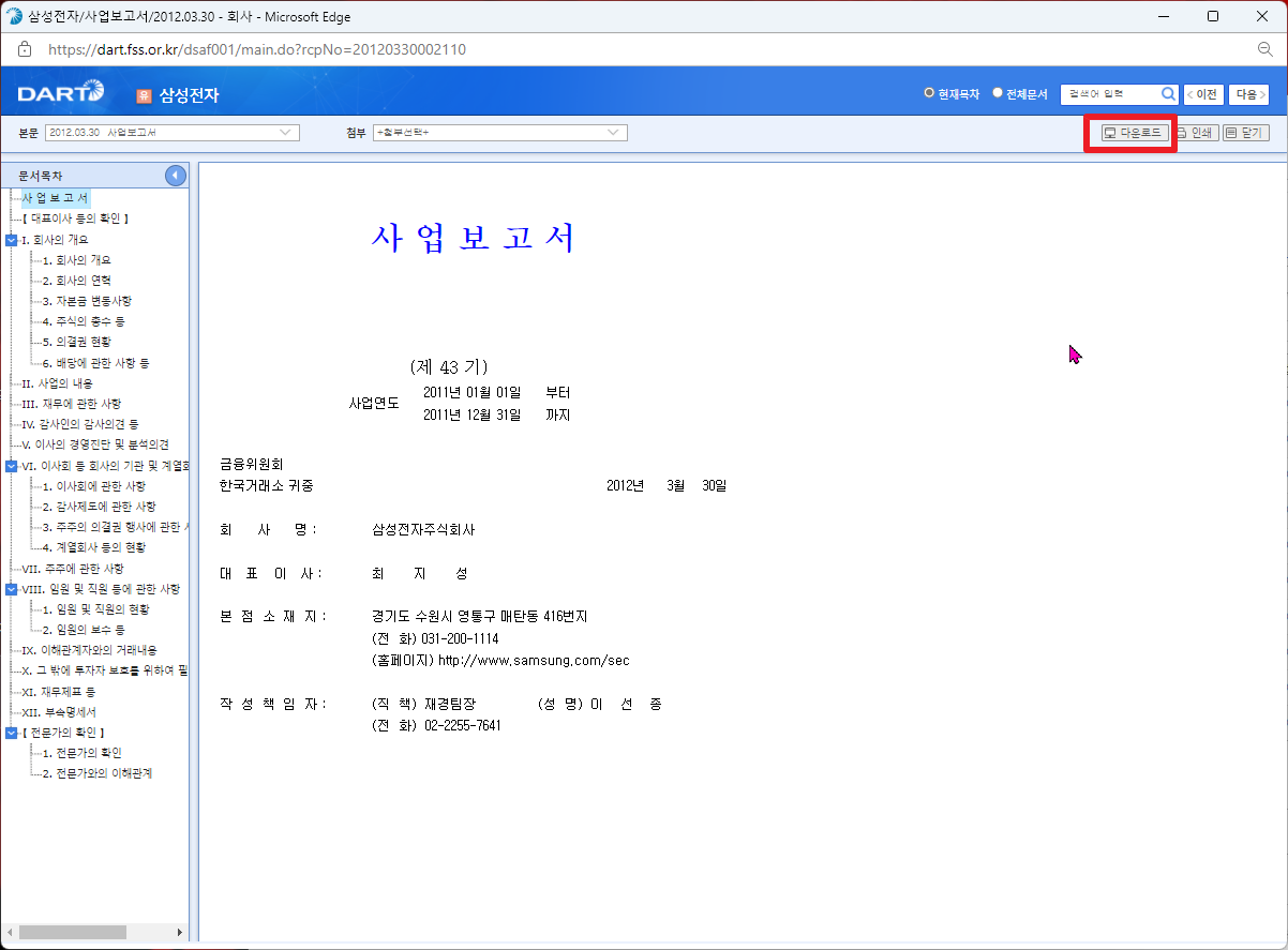 그리고 나서, 검색된 화면에서는 10년간의 사업보고서들이 나타날 것입니다. 여기에서 하나를 클릭하시면 다음과 같이 그 해 해당 사업보고서에 대해서 팝업창으로 나타날 것입니다. 여기에서 상단 우측에 있는 [다운로드]부분을 클릭하여 주시길 바랍니다.