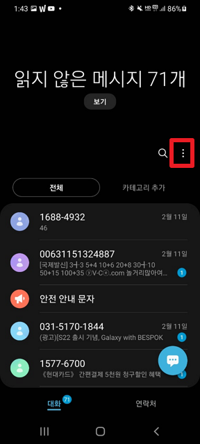 웹 화면에서 문자(메시지)을 클릭하시면 다음과 같은 화면이 나타날 것입니다. 그럼 다음 화면에서 상단 우측에 보이는 더보기 부분을 터치해 주시길 바랍니다.