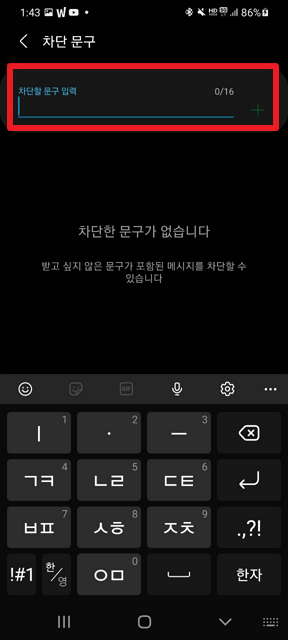 여기에서 차단하기 원하시는 문구, 저의 경우 '국제발신'부분을 입력해 주시길 바랍니다.