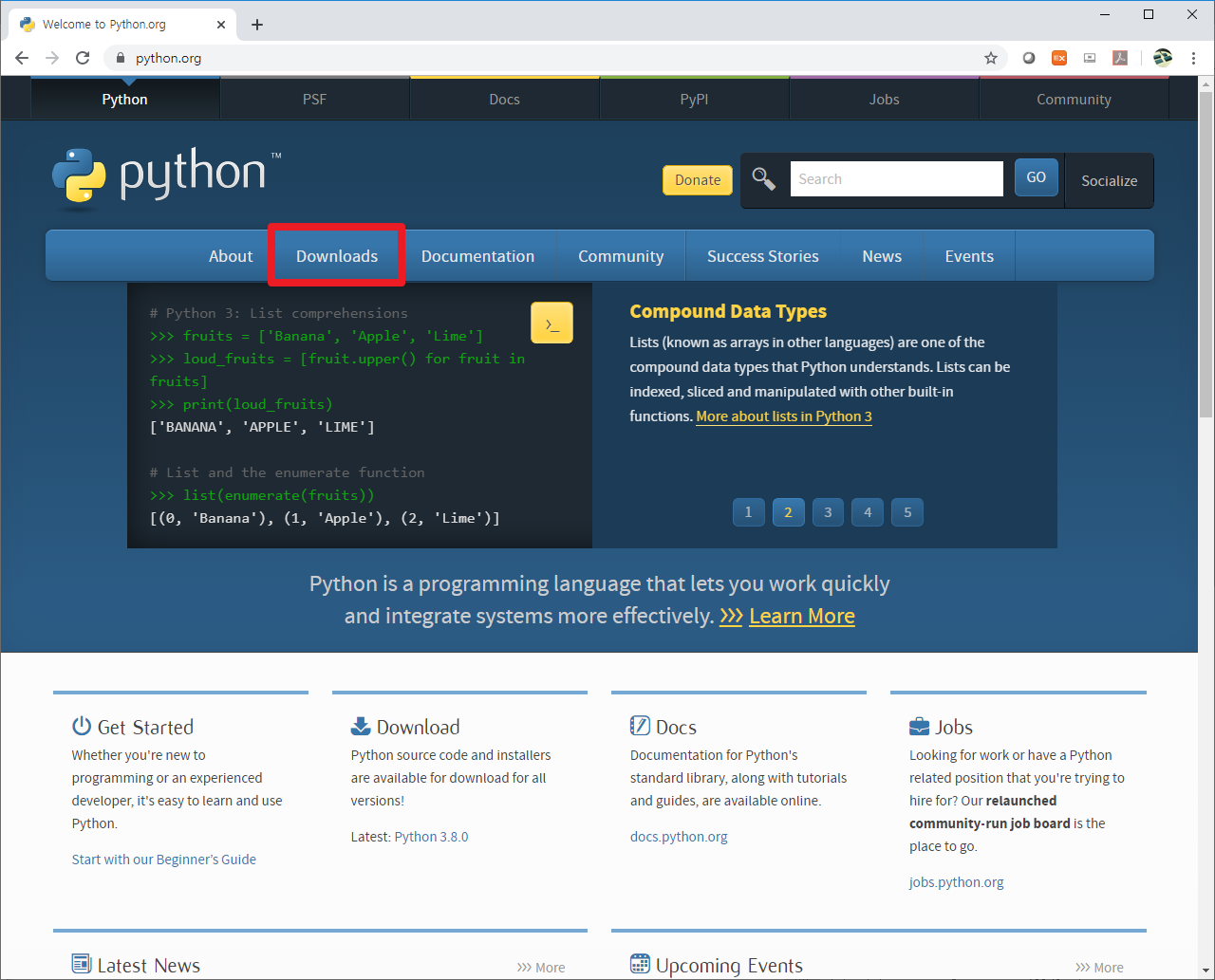 먼저, 파이썬[Python] 공식 홈페이지[https://www.python.org/]로 들어갑니다. 여기에서 상단에 보이는 [Downloads]를 클릭해주세요.