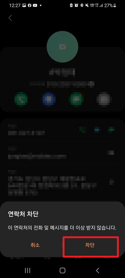 그럼 여기에서 연락처 차단에 대한 추가 메뉴들이 나타날 것입니다. 여기에서 [차단]부분을 터치해주시길 바랍니다.