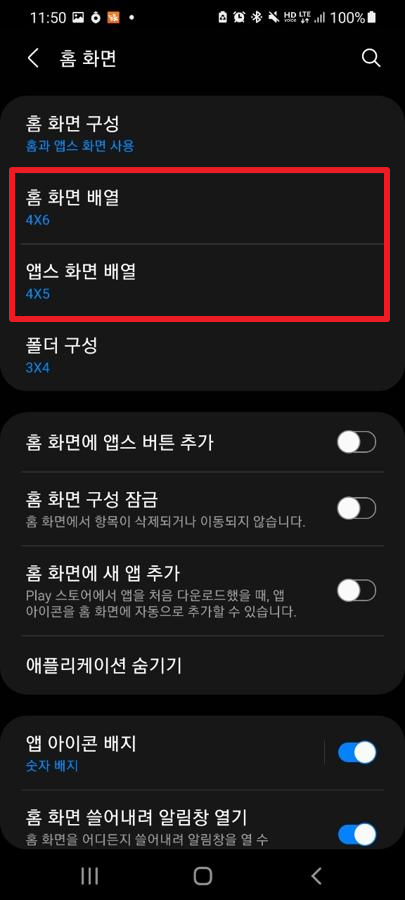 그럼 다음과 같이 현재 홈 화면 배열이 나타납니다. 여기에서 하단에 원하시는 형태로 변경하시면 됩니다.