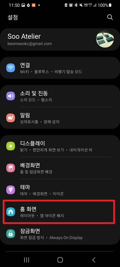그런 후에 다음과 같이 [설정]화면이 나타납니다.여기에서, [홈 화면]부분을 터치해주시길 바랍니다.