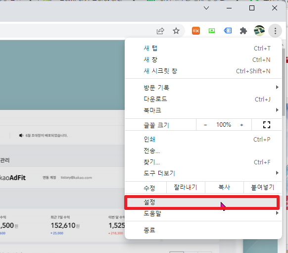 위에서 [더보기]부분을 클릭하셔다면, 다음과 같이 추가 메뉴가 나타날 것입니다. 여기에서 하단에 있는 [설정]부분을 클릭해주시길 바랍니다.