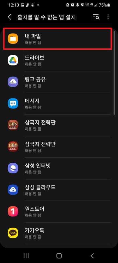 그럼, 각 출처에 대해서 나타나게 됩니다. 해당 하는 출처에 해당 부분에 대해서 선택하여 앱 설치가 가능하도록 설정을 해야합니다. 먼저, 저의 경우에 [내 파일] 부분을 터치해서 관련된 설정을 진행해보도록 하겠습니다.