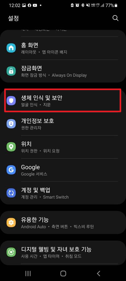 그럼 후에 [생체 인식 및 보안] 부분을 터치해주시길 바랍니다.