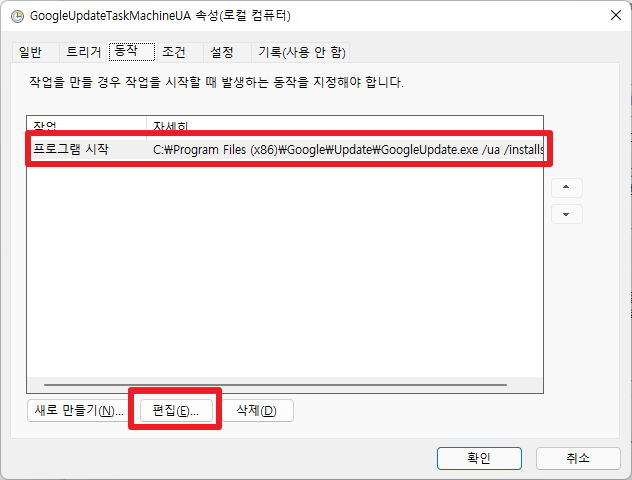 그리고, 해당 부분들 중 하나를 더블 클릭하신 후에 [동작]탭을 클릭하여 주시길 바랍니다. 여기에서 [편집]부분을 클릭하여 주시길 바랍니다.