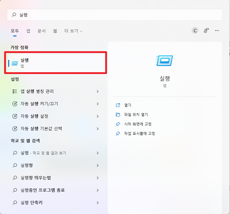 먼저, 윈도우 메뉴에서 "실행"을 입력후 검색하여 [실행]부분을 구동시켜주시길 바랍니다.