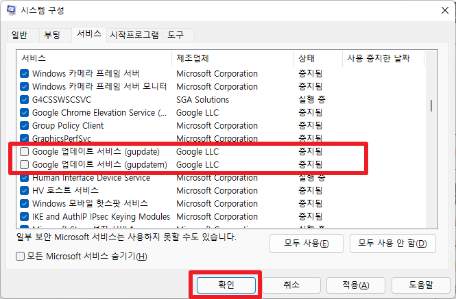 여기에서 Google업데이트 서비스 부분을 모든 체크 해제 하여 주시길 바랍니다. 그런 후에 [확인]버튼을 클릭하여 주시길 바랍니다.
