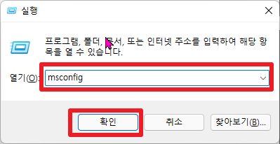 여기에서 [msconfig]부분을 입력하신 후에 [확인]부분을 클릭하여 주시길 바랍니다.