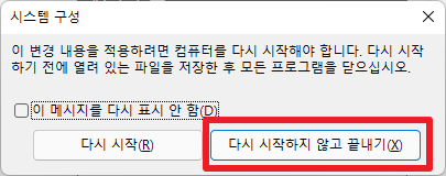 그럼 다음과 같은 안내창이 나타날 것입니다. 여기에서 [다시 시작하지 않고 끝내기]부분을 클릭하여 주시길 바랍니다.