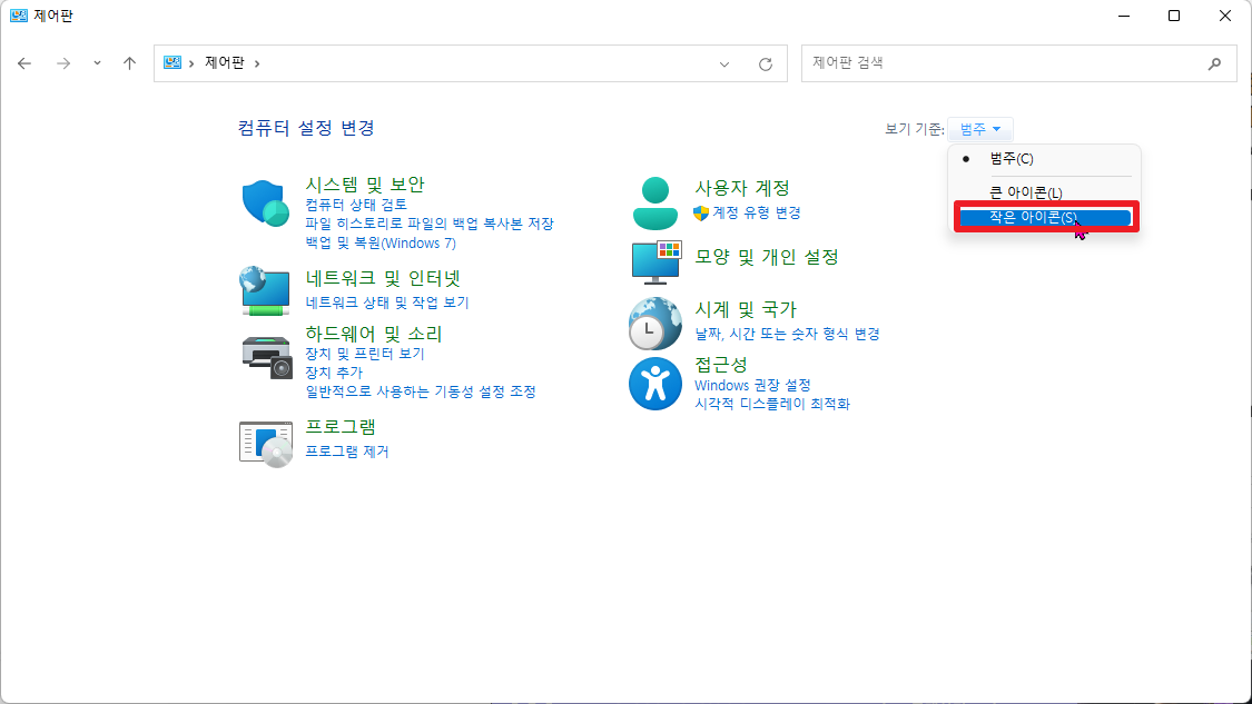 그런 후에 제어판 부분을 실행하여 주시길 바랍니다. 일단, 다음과 같이 나오신다면, 보기 기준의 [범주]부분을 클릭하여 주시길 바랍니다.
