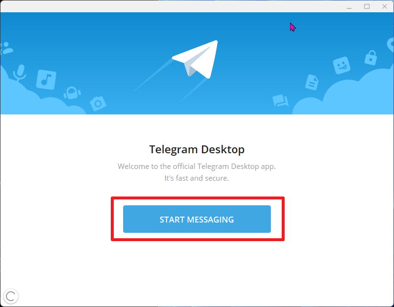 먼저 PC에 설치된 텔레그램을 실행해 주시길 바랍니다. 그럼 다음과 같은 화면이 나타날 것입니다. 여기에서 [START MESSAGING]부분을 클릭하여 주시길 바랍니다.