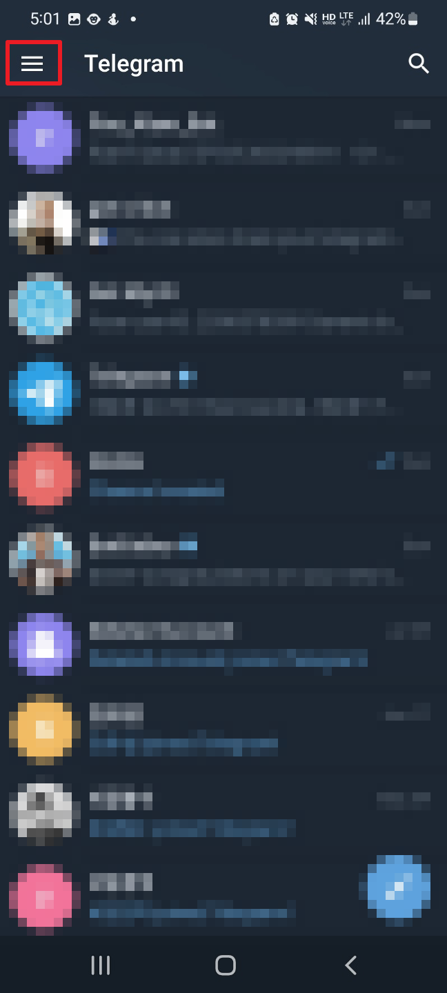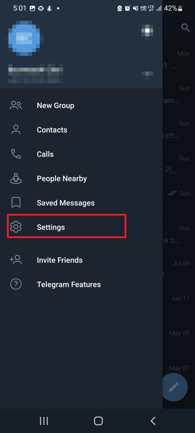 그럼 여기에서 모바일 앱상으로 [텔레그램]부분을 실행하여 주시길 바랍니다. 그럼 우측과 같은 화면이 나타날 것입니다. 여기에서 좌측 상단에 있는 [더보기]부분을 클릭하여 주시길 바랍니다.