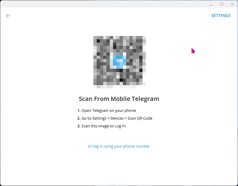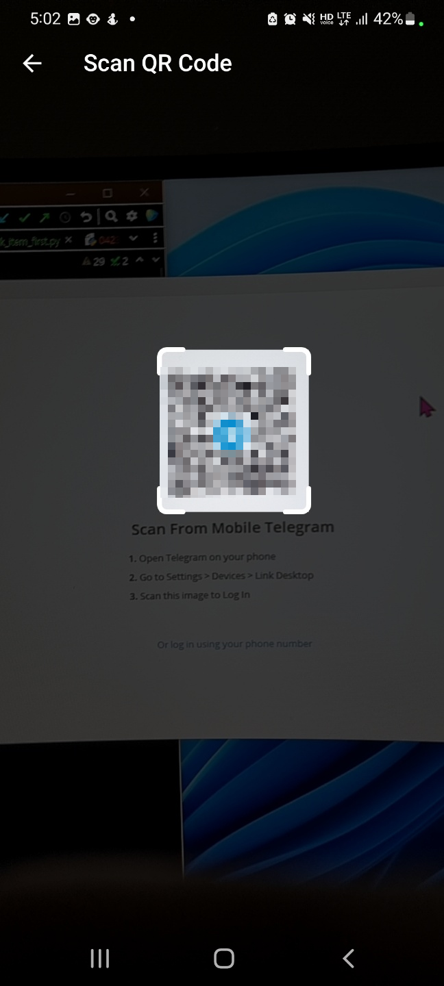 그럼 다음과 같은 QR 코드가 나타날 것입니다. 여기까지 하신 후에 모바일 텔레그램을 실행해야합니다.