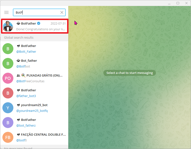 저의 경우 'BotF'만 입력하였지만, 다음과 같은 BotFather 가 검색이 되었습니다. 이 부분을 클릭하여 주시면됩니다.