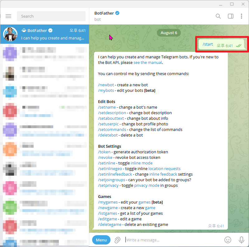 이번 포스팅에서는 [윈도우11 Windows11] 텔레그램 Bot 생성하기(BotFather) 및 key값 확인라는 주제로 포스팅을 해봤습니다. 혹 궁금하신 점이나 문의 사항이 있으시면 언제든지 댓글 및 방명록에 글 남겨주시길 바랍니다. 감사합니다.