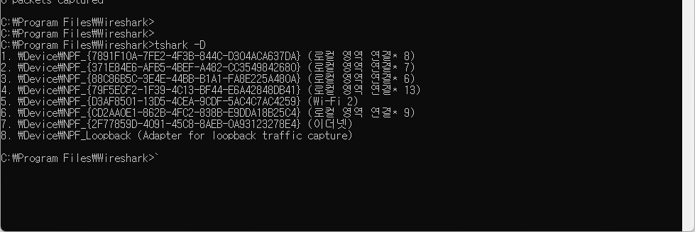 이와 같은 방법으로 와이어샤크(Wireshark)의 CLI 버전인 tshark을 실행할 수 있습니다.