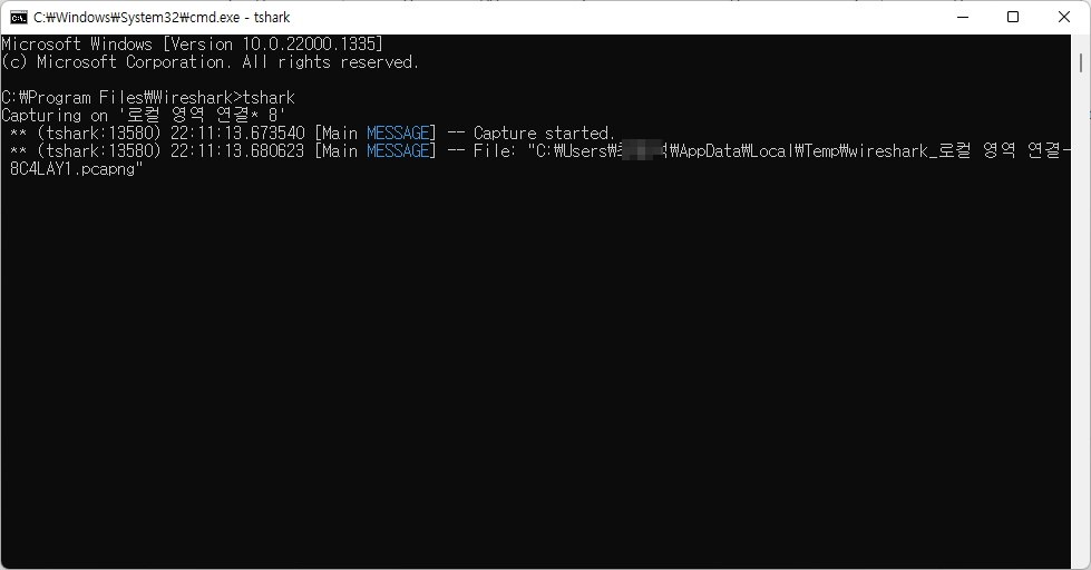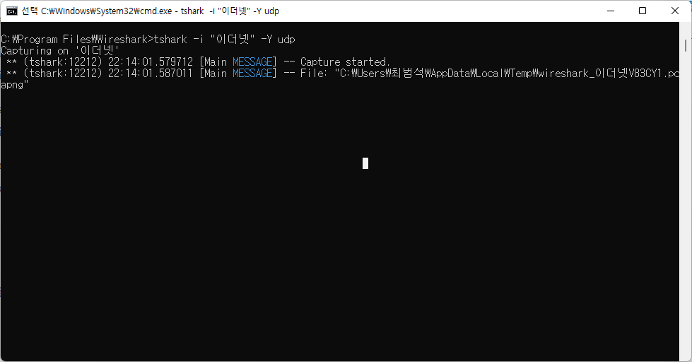 그럼, 이 폴더 기준으로 cmd창을 열어 주시길 바랍니다. 그런 후에 tshark을 실행해 주시면, 기본 설정된 인터페이스를 토대로 패킷 캡처를 진행하게 됩니다. 그리고, 임시 폴더에 저장되는 패킷 이름을 확인할 수 있습니다.