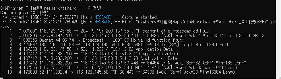 예시를 들면 다음과 같이 tshark -i "이더넷" 형태로 진행을 해봤습니다.