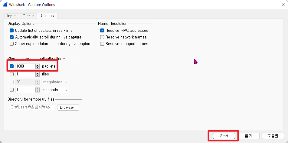 이와 같은 방법으로 와이어샤크(WireShark)의 패킷 캡처를 특정 패킷 개수 만큼 또는 특정용량만큼 할 수 있도록 제한을 둘 수 있습니다.