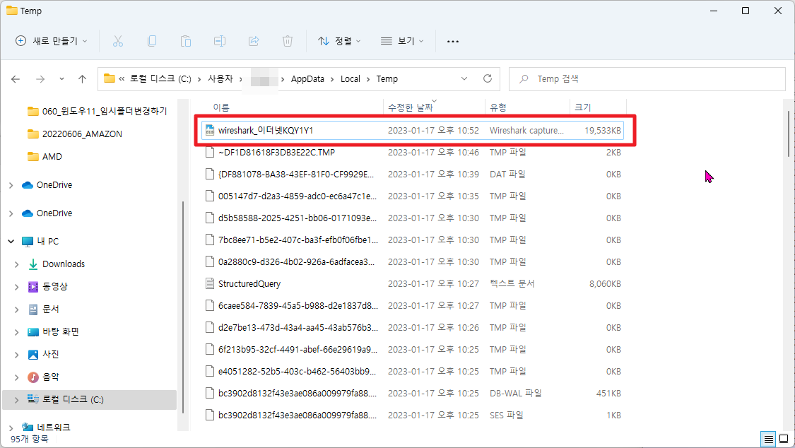 [윈도우10/11, windows10/11] 와이어샤크(wireshark)에서 pcap파일 저장되는 임시 폴더 변경하기