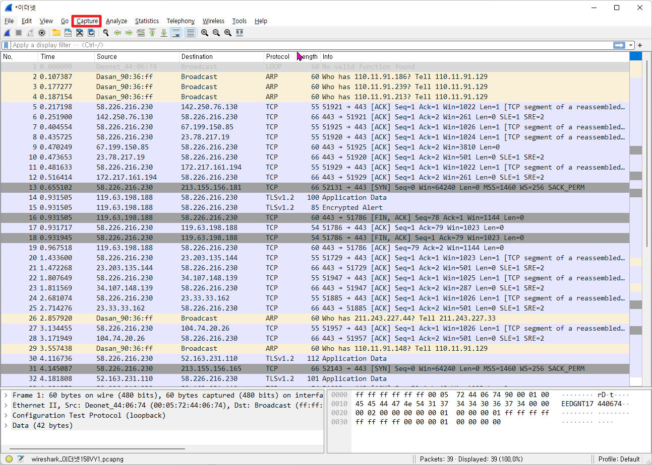 먼저, 와이어샤크(WireShark)를 실행할 경우에 상단에 있는 [Capture]탭을 클릭하여 주시길 바랍니다.