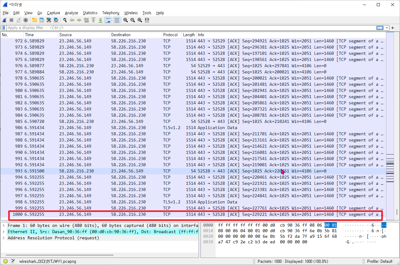 그럼 다음과 같이 1000번째 패킷까지 캡처가 되고, 패킷 캡처가 멈추게 됩니다.