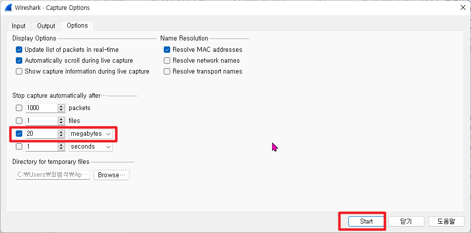 [윈도우11, windows11] 와이어샤크(WireShark) 특정 패킷 개수 또는 특정 용량 까지만 캡처하기 본문