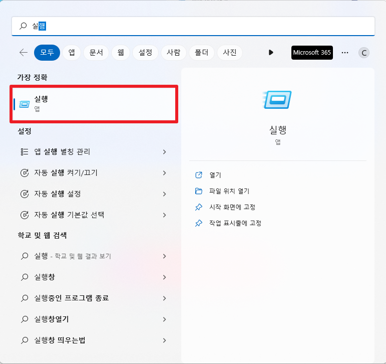 실행 메뉴를 실행하는 방법은 [윈도우키 + R]를 입력하거나, 혹은 윈도우 메뉴에서 "실행"을 검색하셔서 [실행] 아이콘을 클릭하여 실행하셔도 됩니다.