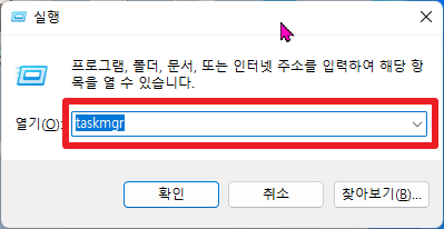 위의 부분을 통해서 실행하면 다음과 같은 다이얼로그가 나타날 것입니다. 여기에서 "taskmgr"입력하여 실행해주시면 작업관리자가 실행이 됩니다.