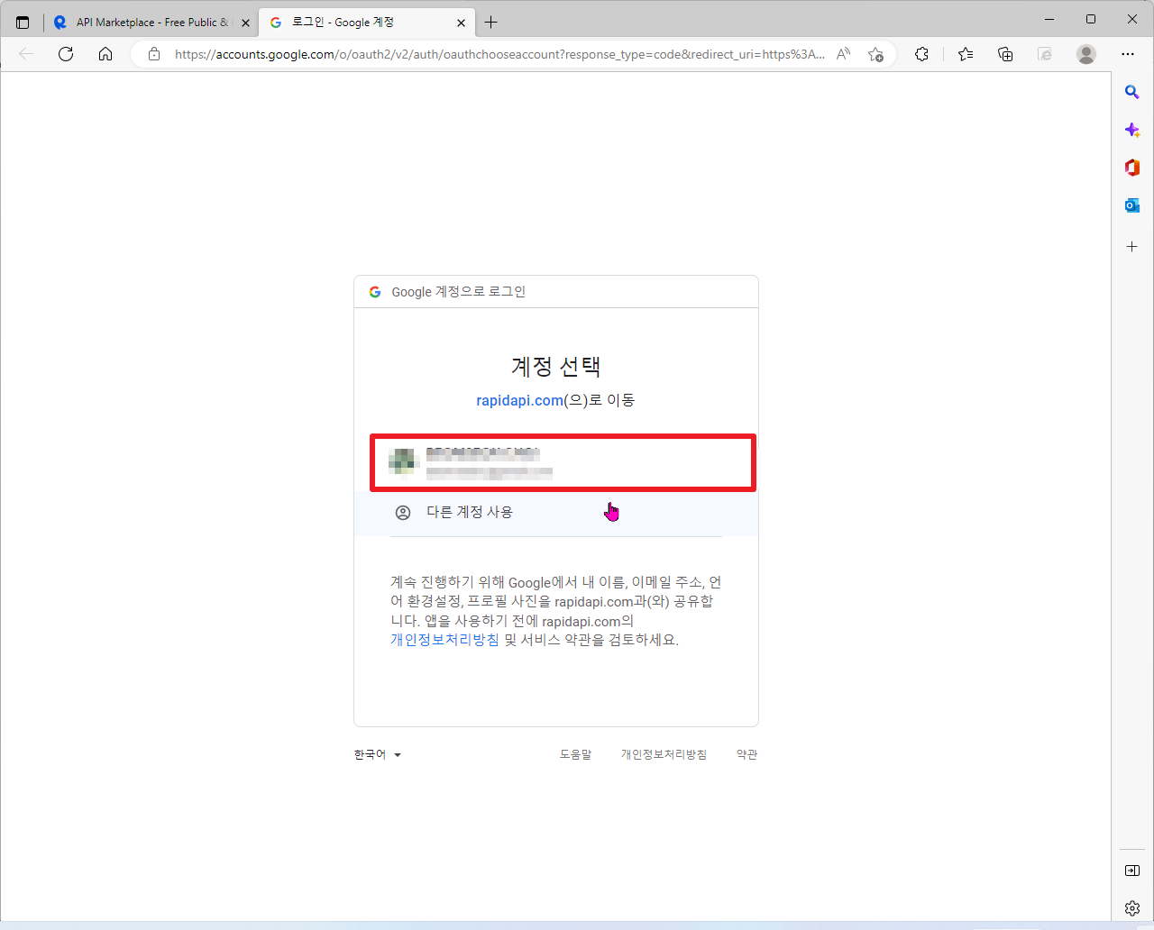 저의 경우 구글(Google) 계정을 통해서 가입을 하였습니다. 그래서 다음과 같이 제가 가지고 있는 아이드를 클릭하여 로그인을 하겠습니다.