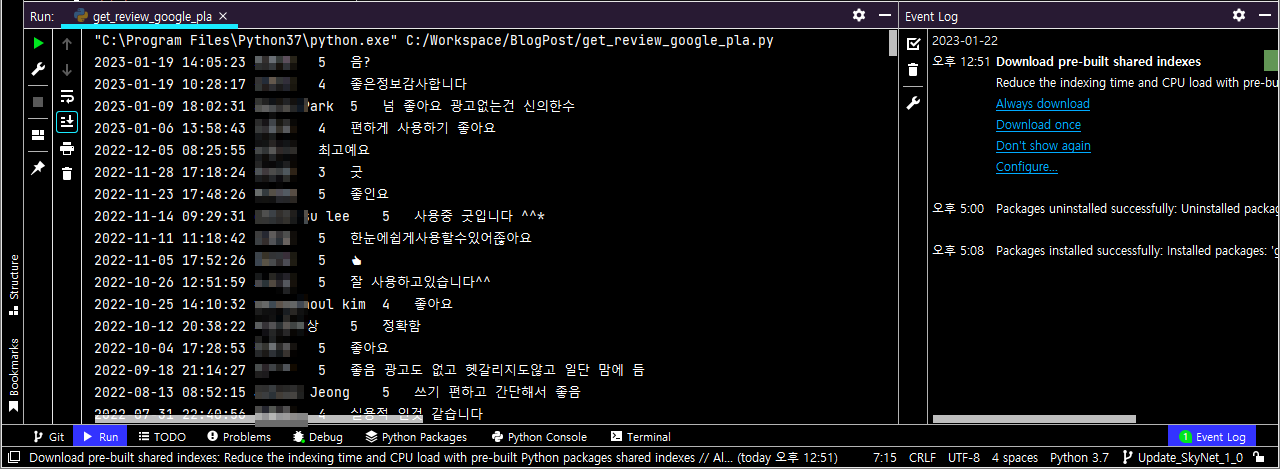파이썬[Python] 구글 앱 평점 및 리뷰 클롤링을 위한 google_play_scraper 설치하기 예전에 주변 사람들에게 현재 개발하고 유지 보수하고 있는 앱들에 대한 평점 및 리뷰를 크롤링 해줄 수 있냐는 문의